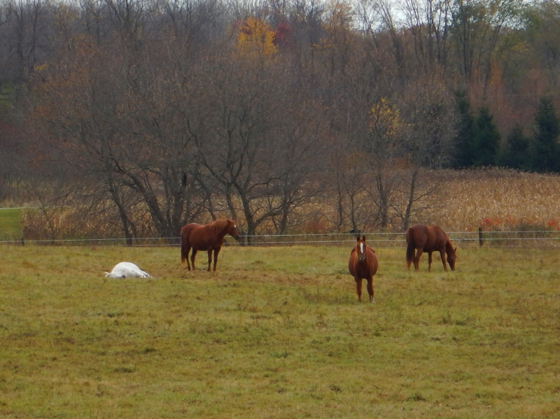 Every time I come upon a view of our horses and find one or more of them lying completely flat on the ground, there is a moment of apprehension. I’ve grown accustomed to the sight of them resting off of their feet, but the number of times when they drop the entire body, including their heads, flat to the ground, are few.
