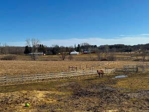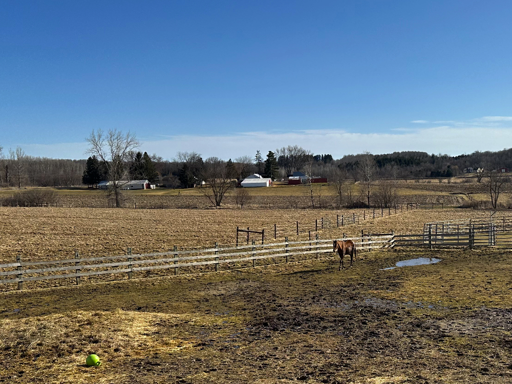 Winter has loosened its icy grip by about 35-40° (F) [think about going from 20-below to 20 above], providing the horses with a break from blankets for a little bit. Mia’s regular blanket went back on for a while because overnight temperatures were still dipping into the single digits. I’m guessing she might be able to go “au naturel” again later today.