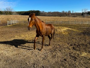 The first day they were with us, we found them standing together in the middle of the small paddock, and even fresh apple slices we offered didn’t entice them to greet us. It looked to me like they were showing us that they had had enough of human interaction. This location was just another stop on a lifetime of being trailered to places they were forced to run, places they were forced to be bred, or eventually, to places they were neglected to near starvation.