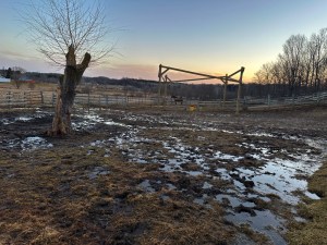 When I walk in the paddocks, I strive to place my boots where the surface looks like it will support my weight. If I make enough trips back and forth, I can pave a smooth path. At the same time, any ground that is thawed where a horse places a hoof becomes a deep crater. A 1,300-pound body can sink its feet more than half a foot into the soil.