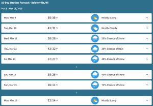 I’ve grown fond of being able to see where we are stepping on walks recently, but the next few days look like the ground could be covered with snow again. Slushy snow, one source predicts. That hint of drying out will soon be a thing of the past.