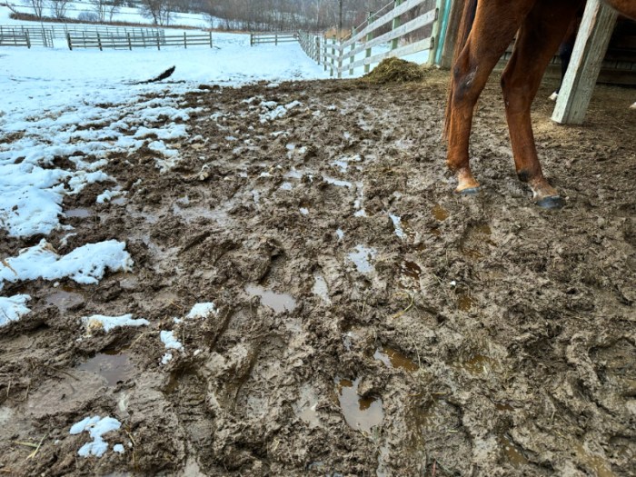 Here’s the part that gets me: the horses then rummage through those piles (mixed with mud and random bits of manure that get raked up with it) and eat from there. Maybe they are pulling out stray bits of good hay that were accidentally mixed in with the bites they dropped to the ground.