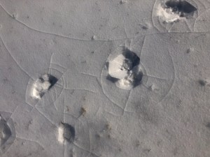 We are enjoying a couple of days with daytime temps climbing above freezing, so our snow cover is dwindling. Walking Delilah along the perimeter trails yesterday, I discovered tire tracks that revealed someone had left the road and driven into the ditch by our property.