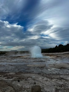 Setting our own agenda made it easy to switch up our itinerary and visit the Strokkur Geyser before the Gullfoss Waterfall simply because we came upon it first on the route from our cabin. The early hour and intense wind had us wrapped up tight against the elements.