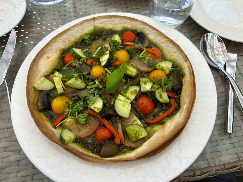 Roasted vegetables pizza on a tortilla crust with pesto sauce. It was as good as it looks. A side of sliced tomatoes with mozzarella, basil, a pesto drizzle, and a small dish of salt flakes was a treat shared by us all.