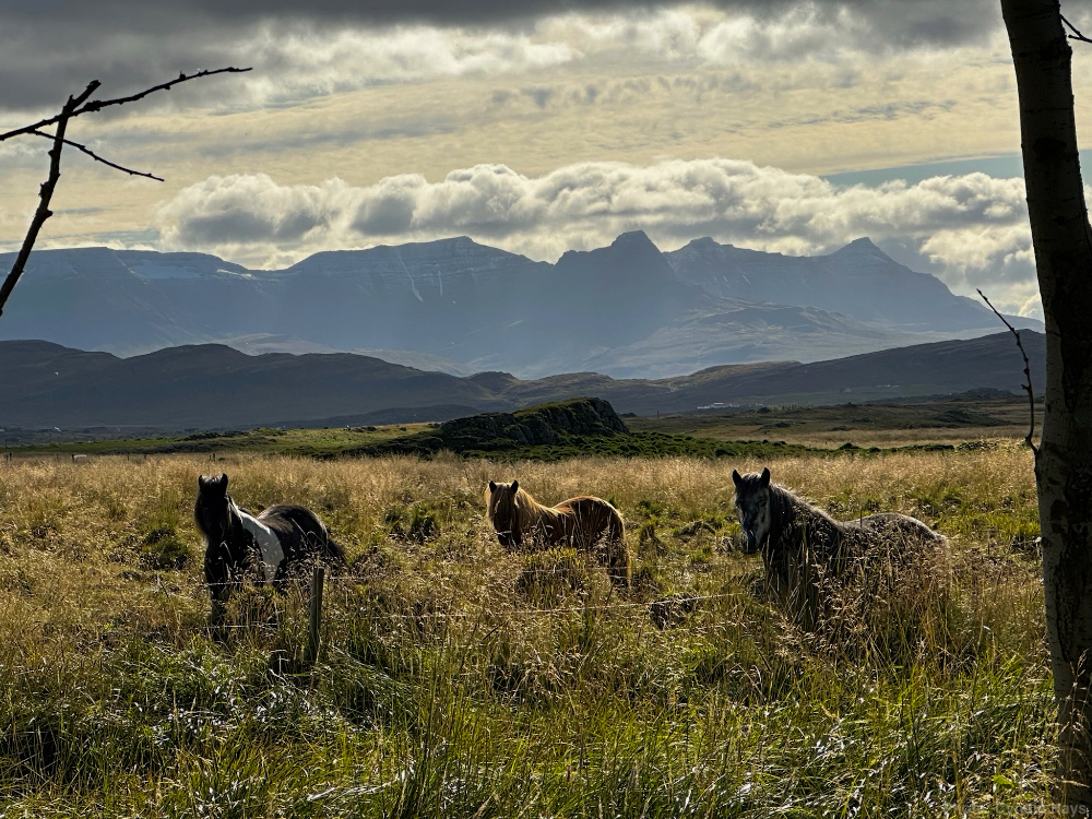 We checked out of our rooms and set out for a 50-minute drive around the coastline of the Hvalfjörður fjord toward the Glymur waterfall. We didn’t tend to stop on the road to photograph sheep or horses that pepper the landscape but these three had just stepped off the road after stopping us, so I took a quick pic before we continued.