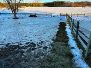 I raked up any scraps of hay and tossed them on the slipperiest-looking spots. Even if that tossed hay freezes on the ground, it still offers improved footing for the horses.