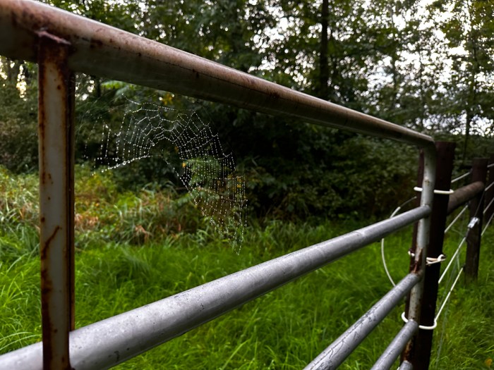 Early morning dew drops cling to a spider web on a gate in the southwest corner of the back pasture. We frequently emerge from the woods at this spot on morning walks with Asher. He almost always tries to choose the fork to the right on the trail that follows the fence line all the way to the road. Each time I remind him that we are on our way to the barn to feed the horses. The fork to the left follows the fence line around the back pasture and leads to the barn.