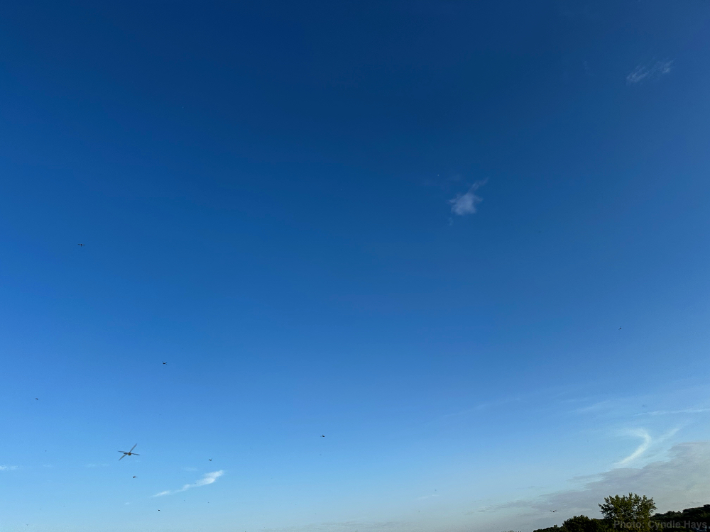 Cyndie happened upon a swarm of dragonflies and tried to capture the spectacle with her phone’s camera in a split-second reaction. Even if there weren’t tiny specs of other dragonflies, I think the one with the obvious four wings makes her photo worthwhile.
