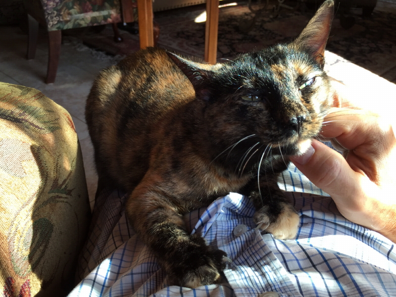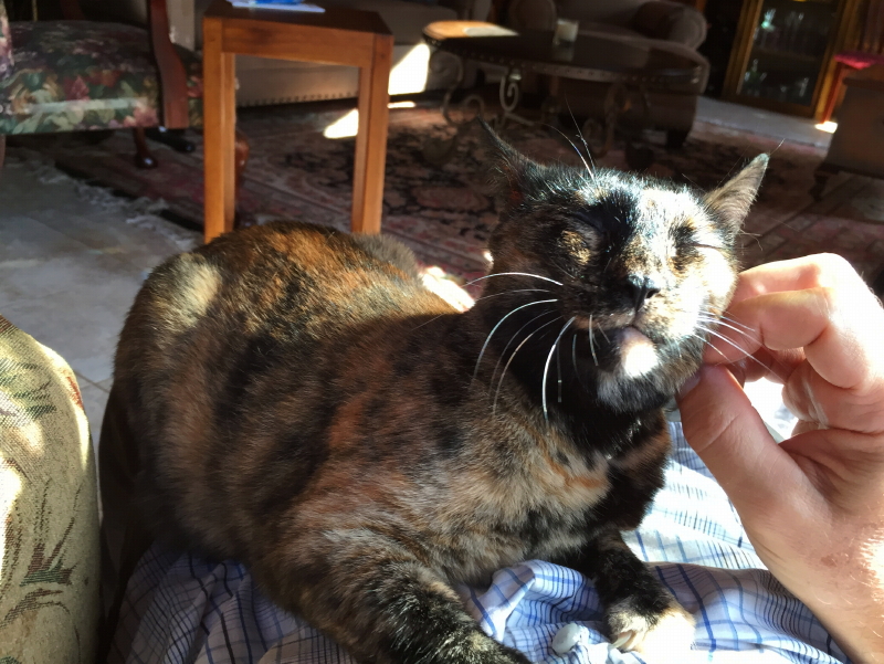 I am at her service, giving her whatever she seems to want the most, in terms of massage and scratching. Her head shifts up and down, to and fro, moving to direct my fingers to the next sweet spot.