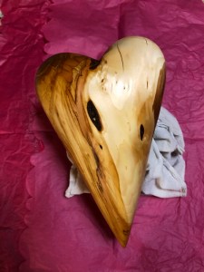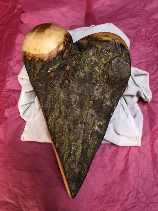 As I am wont to do, I’ve left the backside natural bark and shaped and polished the front into a heart shape from a piece of ash where the tree forked into two branches.