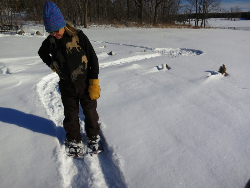 The weather gives, and the weather takes away. After a couple of days with high winds, limited visibility, and repeated doses of accumulating snow, we received a gift on Sunday of blue sky and warm temperatures. We headed down to the labyrinth to reclaim it from days of blowing snow.