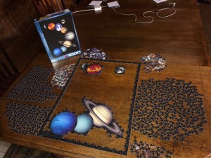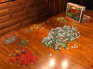After we finished eating, I decided to just dump out the pieces of the puzzle we settled on. Without getting up from the table, we spread out and flipped up all 2000 pieces and started working on the outer border. Jigsaw puzzling soothes my brain like a Zen meditation. It is bringing order to chaos. There is a specific place for each piece and finding and placing those pieces is a series of mini-rewards set on repeat.
