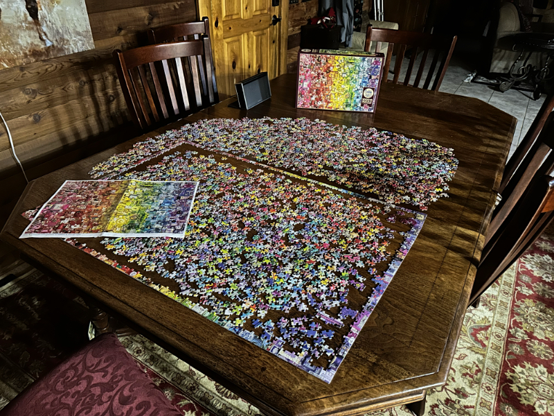 The rest of the day was given to indoor pursuits, beginning with scouring the local newspaper over a warm breakfast. Cyndie and I then each independently processed the day’s Wordle challenge. After that, I lost myself in a jigsaw puzzle while Cyndie was occupied at the other end of the old family table toiling on a craft project.