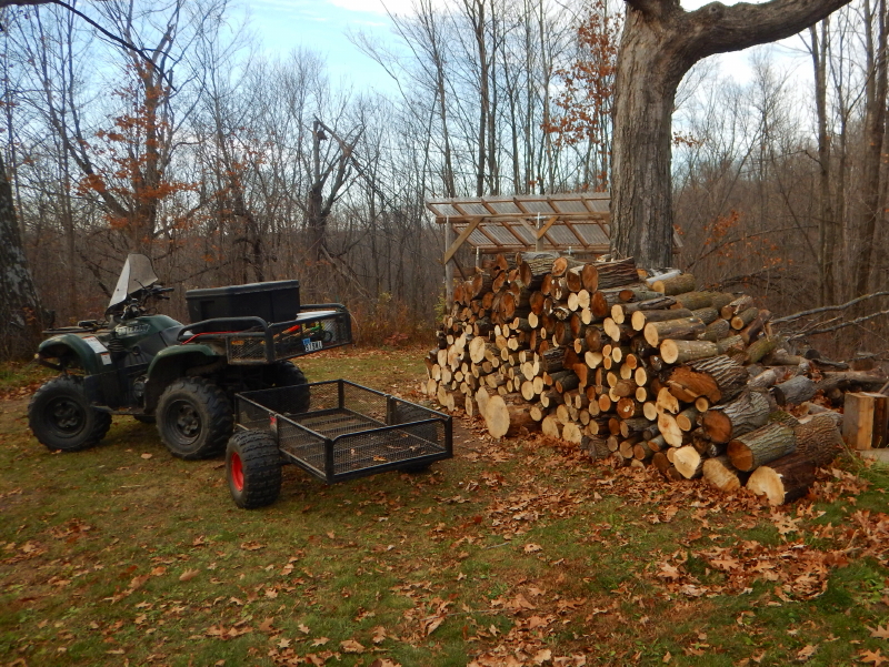 Yesterday, I drove the Grizzly around and collected all the stacks of cut wood that have accumulated from the trees that either fell in the wind, or were cut to clear trails and fence lines. There is no shortage of wood to be split and stacked in the shed. Meanwhile, there are still tree trunks under brush piles that remain to be sawed into fireplace logs, after I chip the branches above them.