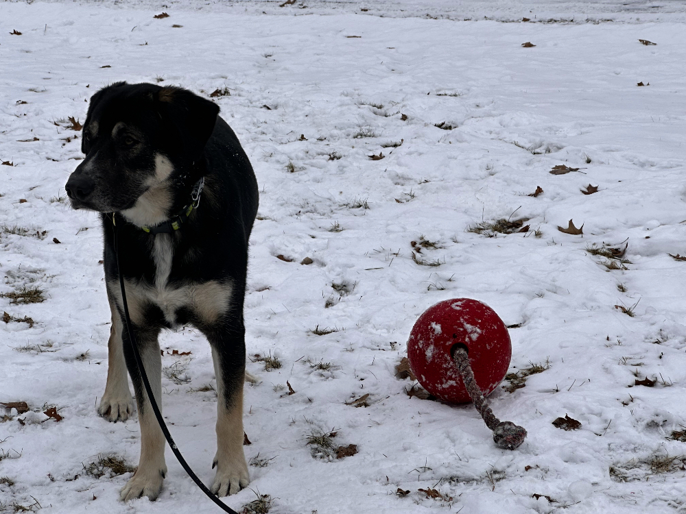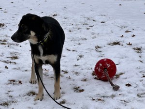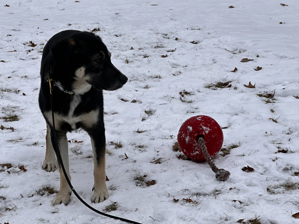 He is so attached to this toy we ended up buying a smaller-sized version that we let him have indoors. He took to the little one right away, but I think he prefers the thickness of the rope in the outdoor ball. He seemed so happy to chew on the rock-hard frozen rope during this cold spell that it gave me the idea of setting one of his indoor felt Kong balls outside long enough to freeze. It made it so hard to chomp in order to squeak it that it wasn’t the thrill for him I imagined.