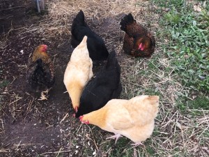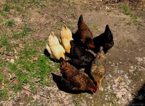 I found myself inexplicably overjoyed upon reading news from Cyndie yesterday morning that “all [eight] hens ran out of coop” together when she opened the hatch. A short time later, she found them all still together, hanging out in our woods. Just as we had read would happen, after a mere two days in the “broody breaker” cage we built, the uncontrolled urge to constantly lay in a nest box has been dispatched. It worked!