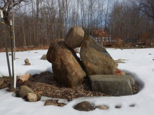 The heavy rock that took five people to lift into place on the boulders at the center of our labyrinth has survived the worst that winter tossed its way. It didn’t fall out and roll to the ground. However, it did lean over to a significant degree.