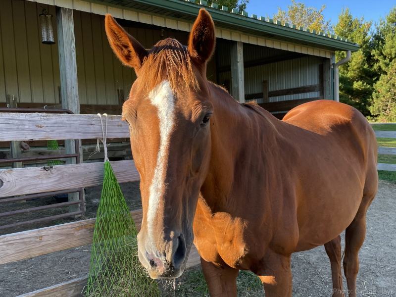 The easiest way to tell them apart is by the markings on their faces. Light has a “round star and stripe” and Mia sports an “irregular stripe.” We usually need to wait for them to turn around to look at us before we are sure which horse is which.