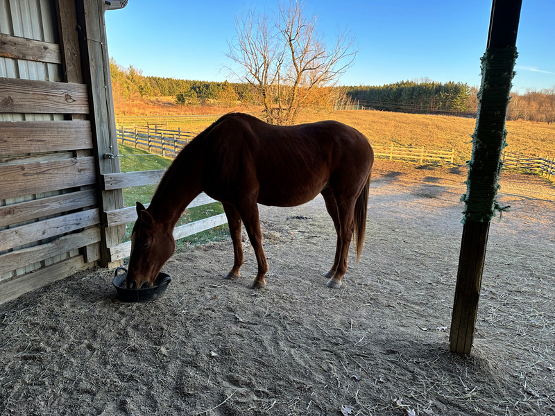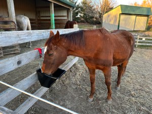 I asked where Swings was this whole time. Cyndie said Swings has been hanging out with Mia, which she doesn’t usually do because Swings doesn’t like Mia. They were grazing grass together and showed little interest in coming up to eat grains.