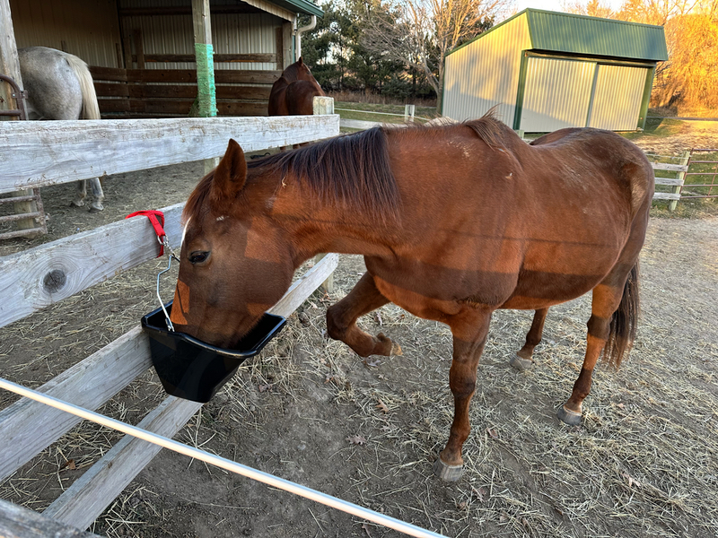 I kept hearing her bucket getting bounced around but I missed seeing if it was from kicking it or knocking it with her snout. Each time I looked back in her direction, she was munching away normally.
