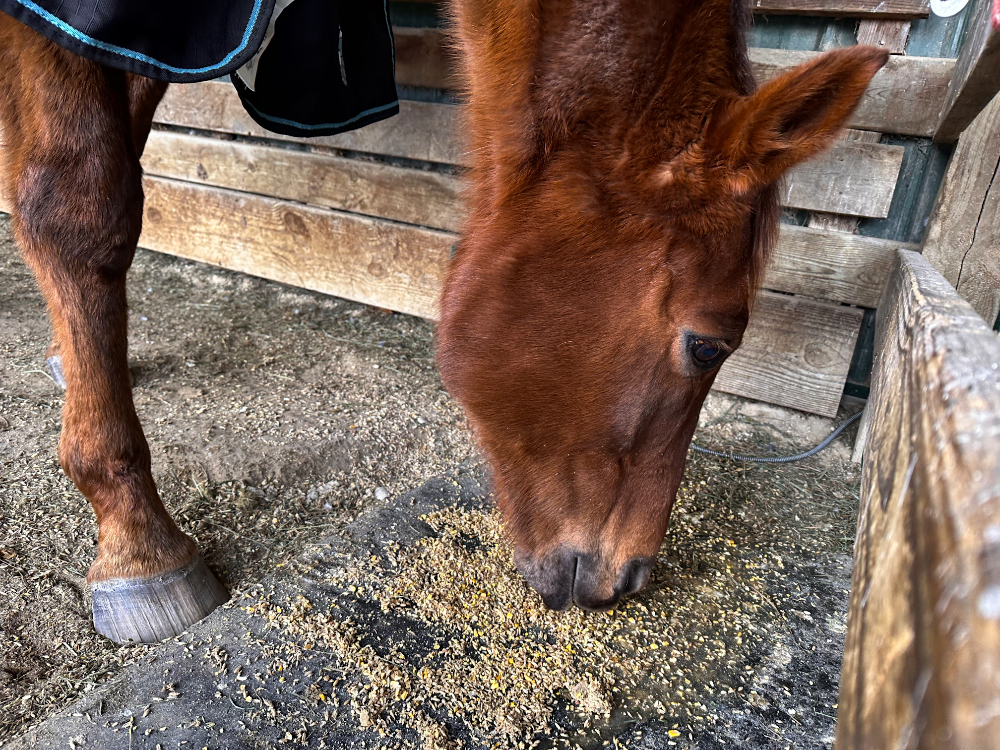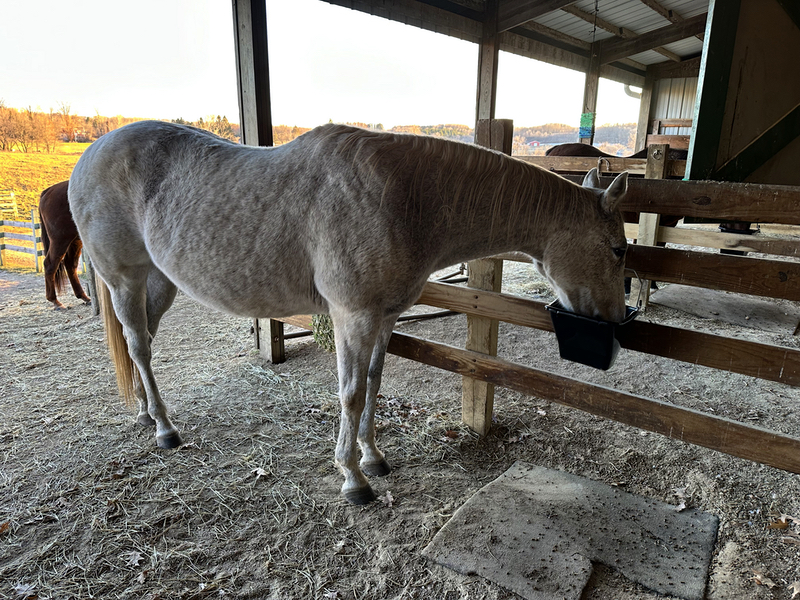 One of Light’s behaviors that we see almost every feeding session is a leg spasm motion and a tendency to paw at her feed pan, almost always resulting in tipping it over or stepping directly in the middle of her food. It doesn’t seem to faze her one bit and she just continues eating from the dirt or switching over to another horse’s pan (Swings or Mia; never Mix).