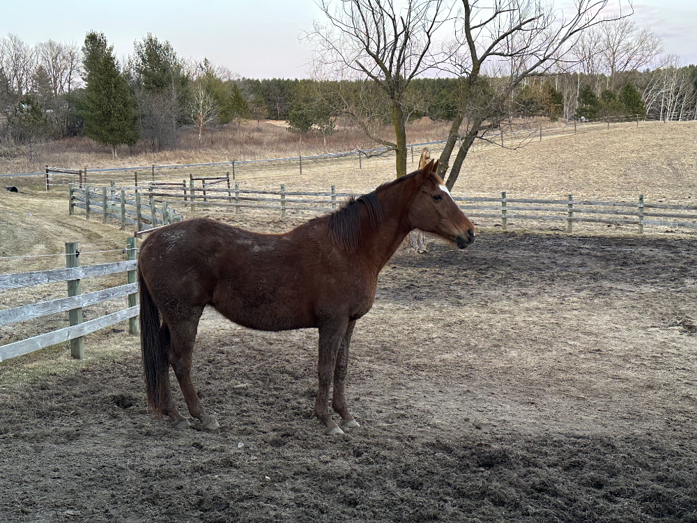Light will be the envy of any well-dressed herd with her new self-made mottled pattern covering her from head to hoof on both sides. The expertly daubed design of the clay-like smudges highlights her bold features exquisitely. Light’s cheekbones are perfectly accentuated with just the right application of the freshly thawed lime screenings. Smartly blending her natural chestnut hues with the expansive palette of colors available on the snowless surface of both paddocks, Light is offering a proud tribute to her cousins of the painted breeds.