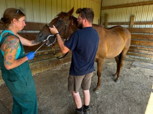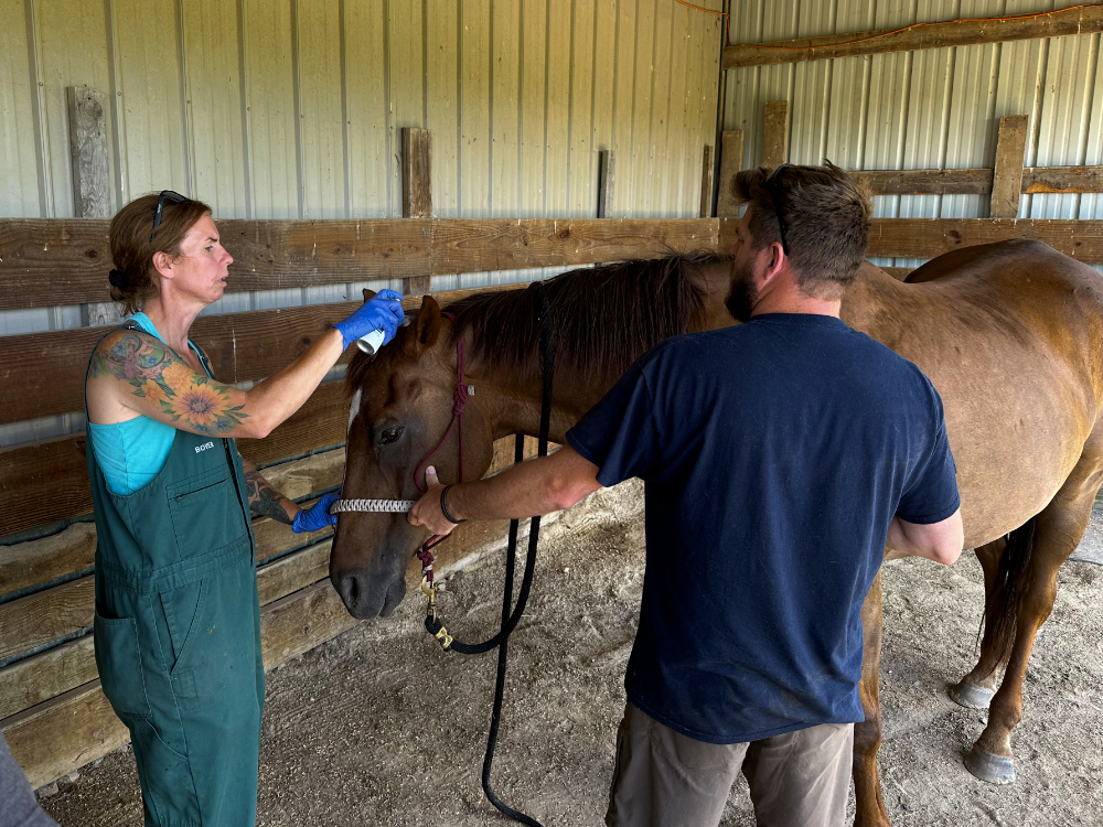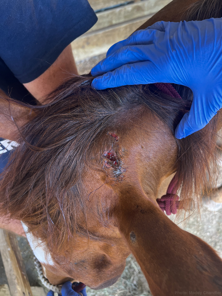 I thought it looked neurological. Before the Vet arrived, Maddy, our handler from This Old Horse, showed up to help get things prepared. She is the one who spotted a brief glimpse of a wound under Light’s mane, between her ears. We couldn’t get Light to settle down enough to check it, but at least now we knew what we were dealing with.