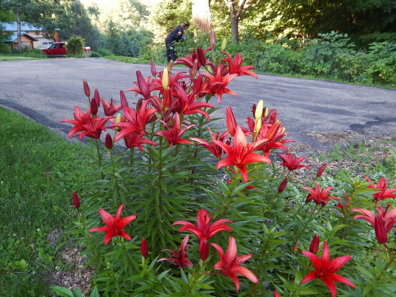 Another new addition to our landscape is bursting open like 4th of July fireworks! The first of the many colors of lilies at the top of our driveway are in full bloom.