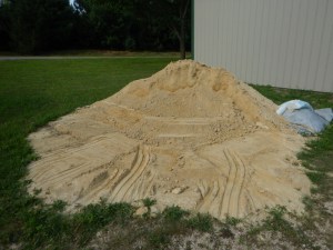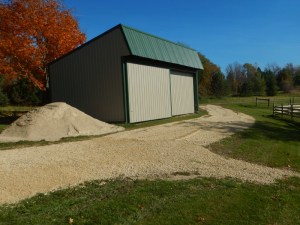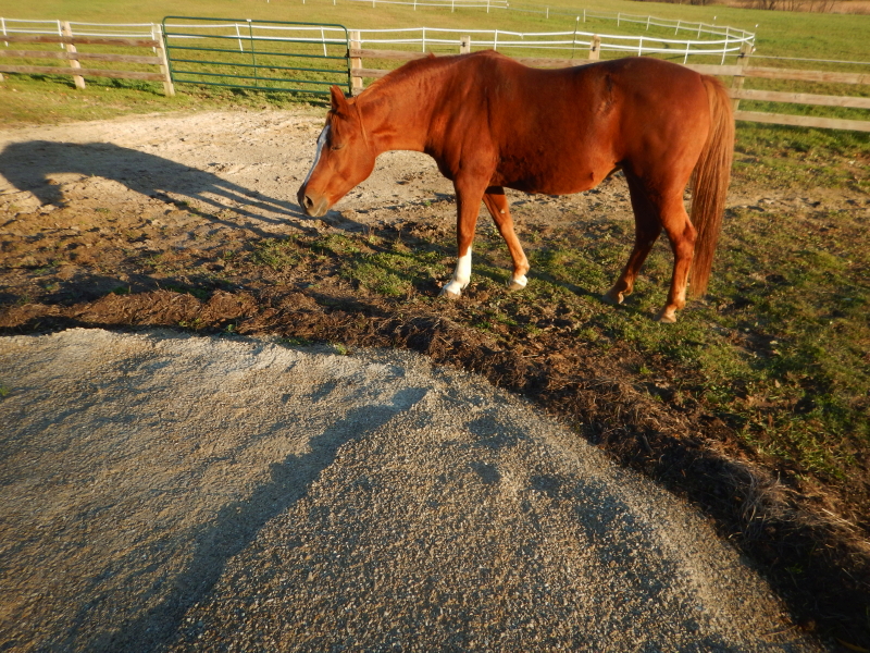The pile visible in the photo on the right isn’t more gravel. It’s the lime screenings that we distribute in the paddocks to improve the footing for the horses by reducing areas of mud. After heavy downpours, we use screenings from the pile to fill in the rills that may have formed.