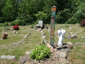 While the chainsaw was out, I hoofed my way down to the woods behind the labyrinth to cut up a dead tree that fell across one of our small side trails. At the labyrinth, I removed the stakes that secured the transplanted maple now that it seems to have established itself. There, I discovered the deer have been feasting on the hostas by the peace pole.