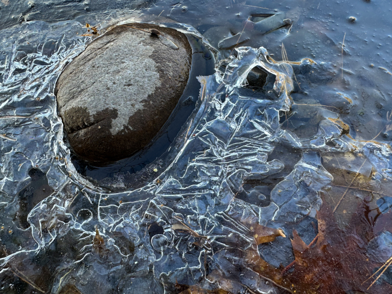 We don’t usually spend much time up at the lake when the ice is about to vanish from the water’s surface. I find it very entertaining. Temperatures dropped far enough below freezing Sunday night that water to the shore, which was liquid when we arrived, had refrozen solid by yesterday morning.