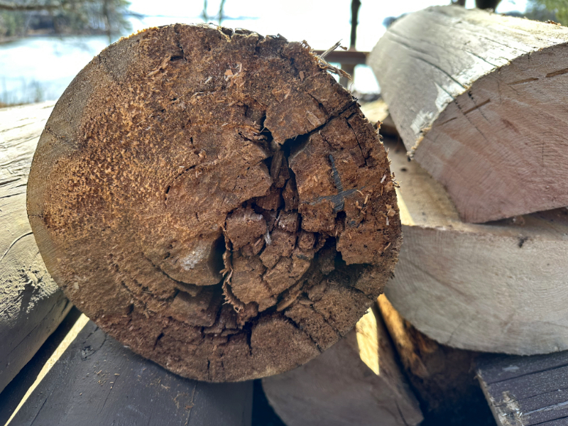 There’s no turning back now. The guys started cutting away the rotting logs of the truss yesterday under the hot rays of mid-sixty-degree sunshine up in the Hayward area.