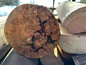 The view of this cross-section shows the degree to which the log was disintegrating. They also uncovered the bees’ nest I knew was there. Good thing there were no bees present at this time of year.