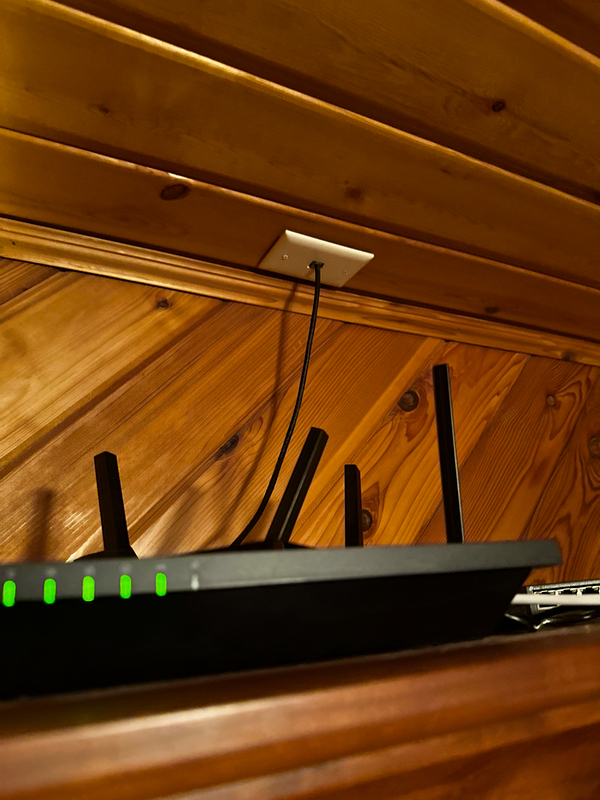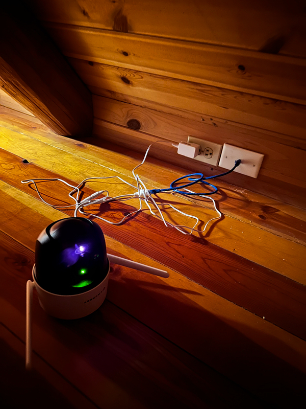 I plugged the camera in to test my new connections and verified everything worked. The portion remaining involves drilling through the log wall at the peak of the loft ceiling to bring the cable from the repeater inside. Then I need to seal around that cable to prevent mice and bats from taking this new opening as an invitation to come live with us.