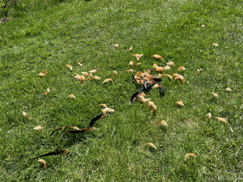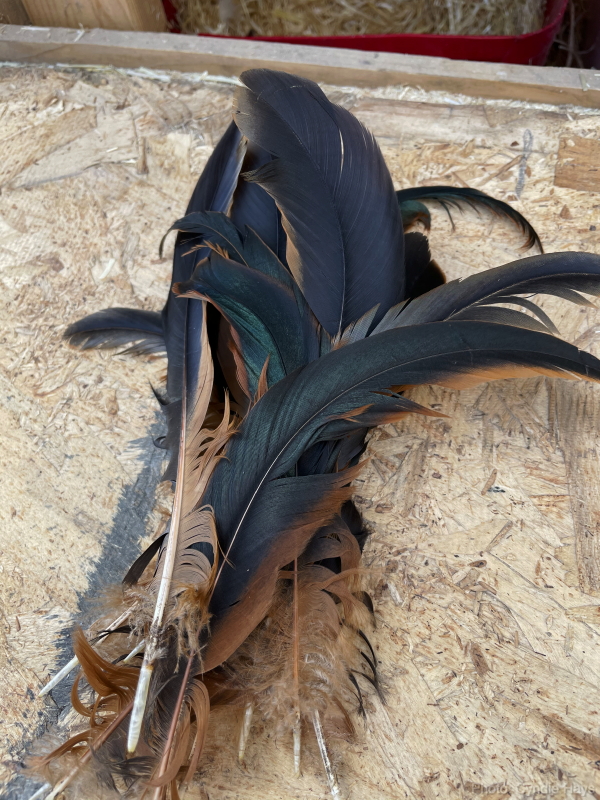 Cyndie picked up Rocky’s sickle feathers. We can only imagine what the fracas must have been like. I was at work and Cyndie never heard a sound. Most likely the horses would have been unsettled by the energy of predators on a killing spree. When Cyndie came out, everything was calm and collected.
