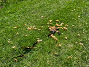 We are down five hens, leaving eight survivors and Rocky. There is no way of knowing what our new rooster may have achieved during the fracas, but one version is that he saved eight. In fact, it’s possible he kept the Buff from being killed and carried away, which is interesting to contemplate since he was usually busy trying to excommunicate her from the group whenever possible.