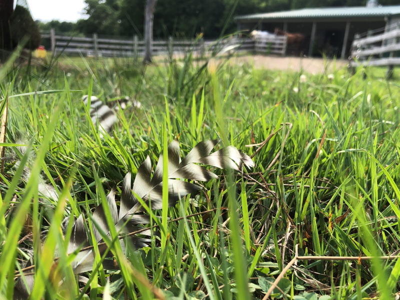 As I was cleaning up three days of manure in the paddocks, I spoke out loud to myself when I spotted the distinct feather markings of Buffalo Bill. It looked like he didn’t give in without covering a bit of distance.