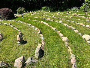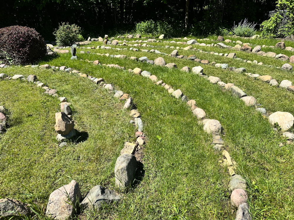 Not unlike the methods we have employed on the driveway, chipping away at a big job in small portions, this week we have been giving the labyrinth a thorough going over. So thorough, we have been moving and replacing each of the rocks while weeding and trimming the grass around and beneath them.
