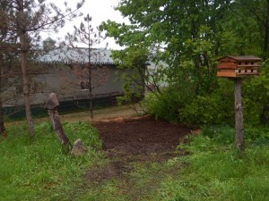 Luckily, there is a spot next to the barn where we’ve been using composted manure and old hay to fill in a drop in the landscape. The area had been a too convenient runway for water drainage that was problematic. Bringing it back to level with the surrounding area will spread and slow water flowing from above.