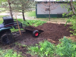 Out came the Grizzly, after putting air in the leaky front tire, and the metal grate trailer for an increasingly muddier series of loads from the compost area. Very similar to working on moving innumerable bales of hay, as time goes by, the loads seemed to get heavier and heavier and I started to move slower and slower. Cyndie pushed back against my increasing moments of pause, with a goal of getting the job done as quickly as possible so she could get in out of the cold and wet.
