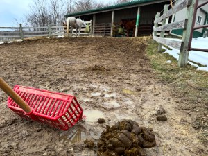 I’m already trying to recall my routine of resuming active composting after winter releases its grip. Those of you who keep dogs in your backyard in places where snow covers the ground for months know what the ground looks like when the snow first melts. Multiply that mental image by the volume four horses produce.