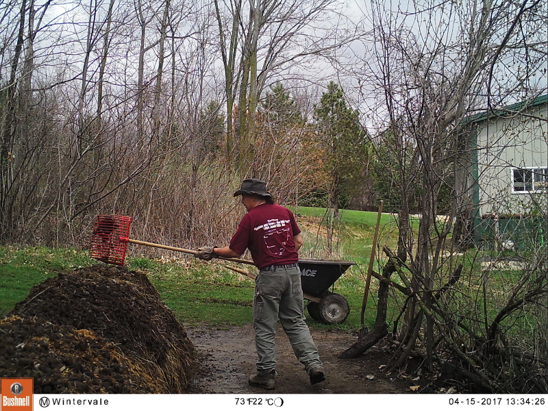 Before we moved the chicks out to the coop, we had dumped some of their droppings in the manure pile and noticed how hyper it made Delilah over the scent. Thinking it might do the same thing to natural predators, we decided to move the trail-cam to monitor the pile for a few days to survey for night prowlers attracted to the new chicken smells.