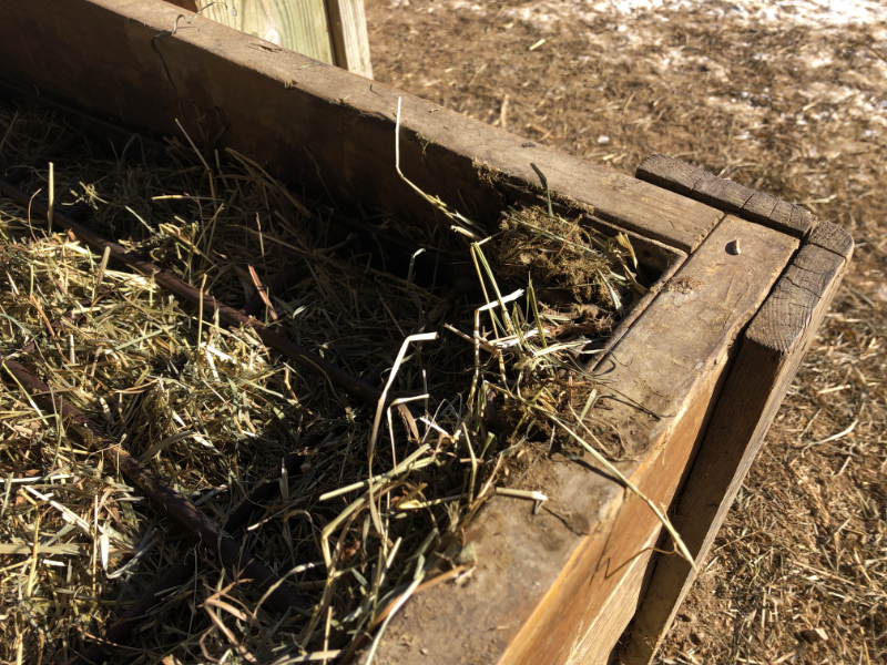 Under the barn overhang, I was met by evidence the horses had been under there all night. If they spend time out in the fields, I don’t scoop up the piles. Under the overhang, we try to remove their manure as fast as they produce it. Maybe it was because there was poop everywhere that one of them decided to do their business over one of the hay boxes.