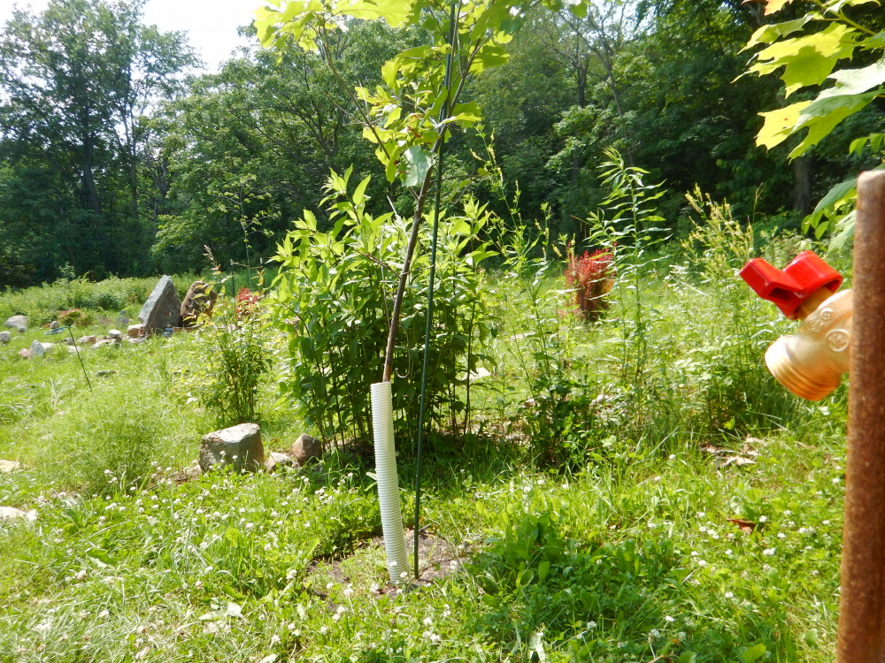 This tree is currently holding its leaves longer into the summer than any of the previous attempts did. Between our extra effort and the favorable weather conditions this year, I’m finally allowing myself to hope this one will take, maybe even flourish!