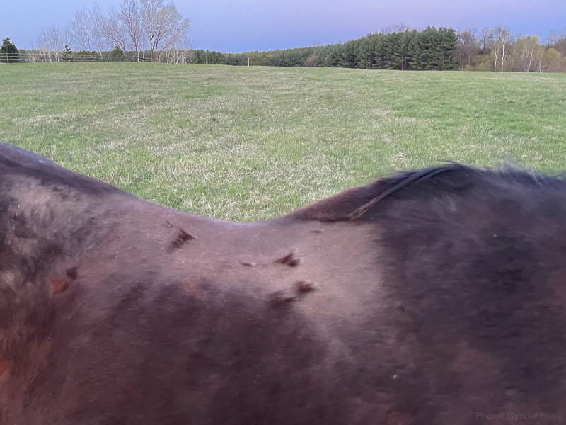 While our horses are showing good signs of becoming more comfortable with their situation here, Cyndie needed to call for the vet yesterday to check on Light who appears to have a possible sinus infection. While he was here, Cyndie was able to confirm our suspicions about Swings suffering from a bout of rain rot, a skin infection.