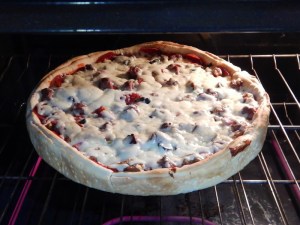 When Cyndie would come home to visit the year she worked in Boston, MA, she would order a pizza while still at the airport and pick it up on the way, carrying a fresh deep dish in the door when she arrived.