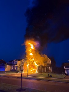 In the early morning hours yesterday, one of Cyndie’s brothers woke to a smoke alarm going off, and he and his son were able to get out of the back door unharmed. They stood with neighbors and watched the conflagration for twenty minutes before the firefighters arrived.