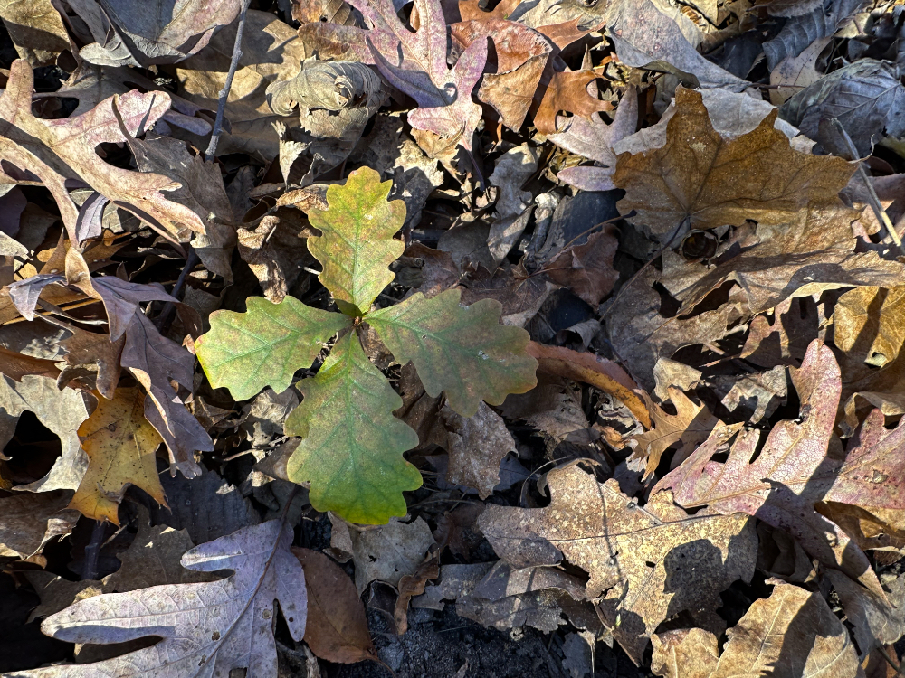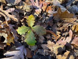 There was a tiny oak sprout that caught my attention, barely tall enough to stand above the dead leaf blanket covering the ground in November. The leaves were so perfect. Apparently, too young to keep up with all the bigger trees that have the fall routine figured out.