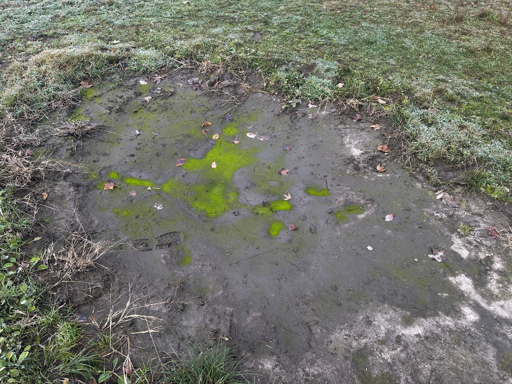 My footprint was a result of retrieving the horses’ Jolly Ball that had rolled into the middle of the muddy remains of the “lake.” It’s always interesting to find the ball has been relocated from the spots where I place it, handle up, in hopes of enticing them to play.